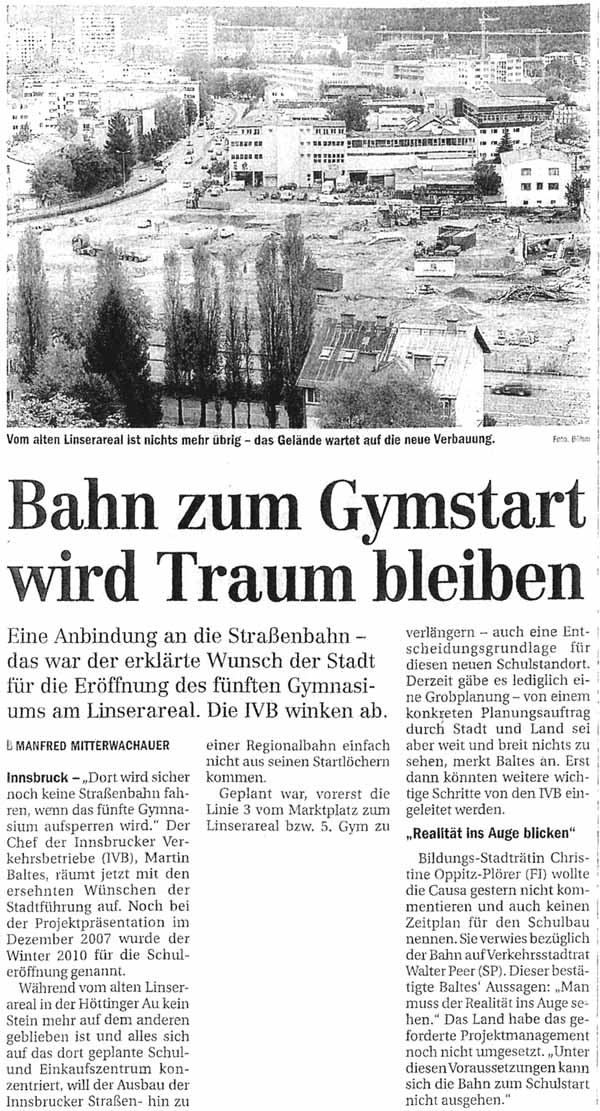 Das alles mit dem Versprechen, im Jahr 2008 mit der baulichen Umsetzung der Straßenbahnlinie O und der Stadtbahn zwischen Völs und Rum, später auch noch der Straßenbahnlinie 3 nach Hötting-West und der Stadtbahn nach Hall zu beginnen.