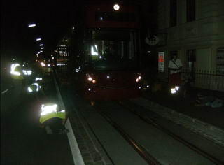 Danach wurde der Wagen zurückgefahren zum Beginn der Steigung bei der Haltestelle Gmundner Keramik, um bis weit nach 2 Uhr im Abschnitt zwischen Arkadenhaus und Tennisplatz Brems- und Anfahrtests im Steilstück zu absolvieren.