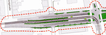 Die westseitigen Tunnelrampen werden sich nach den aktuellen Planungen südlich und nördlich des Straßenbahngleiskörpers im Bereich der Haltestelle Fritz-Konzert-Straße befinden.